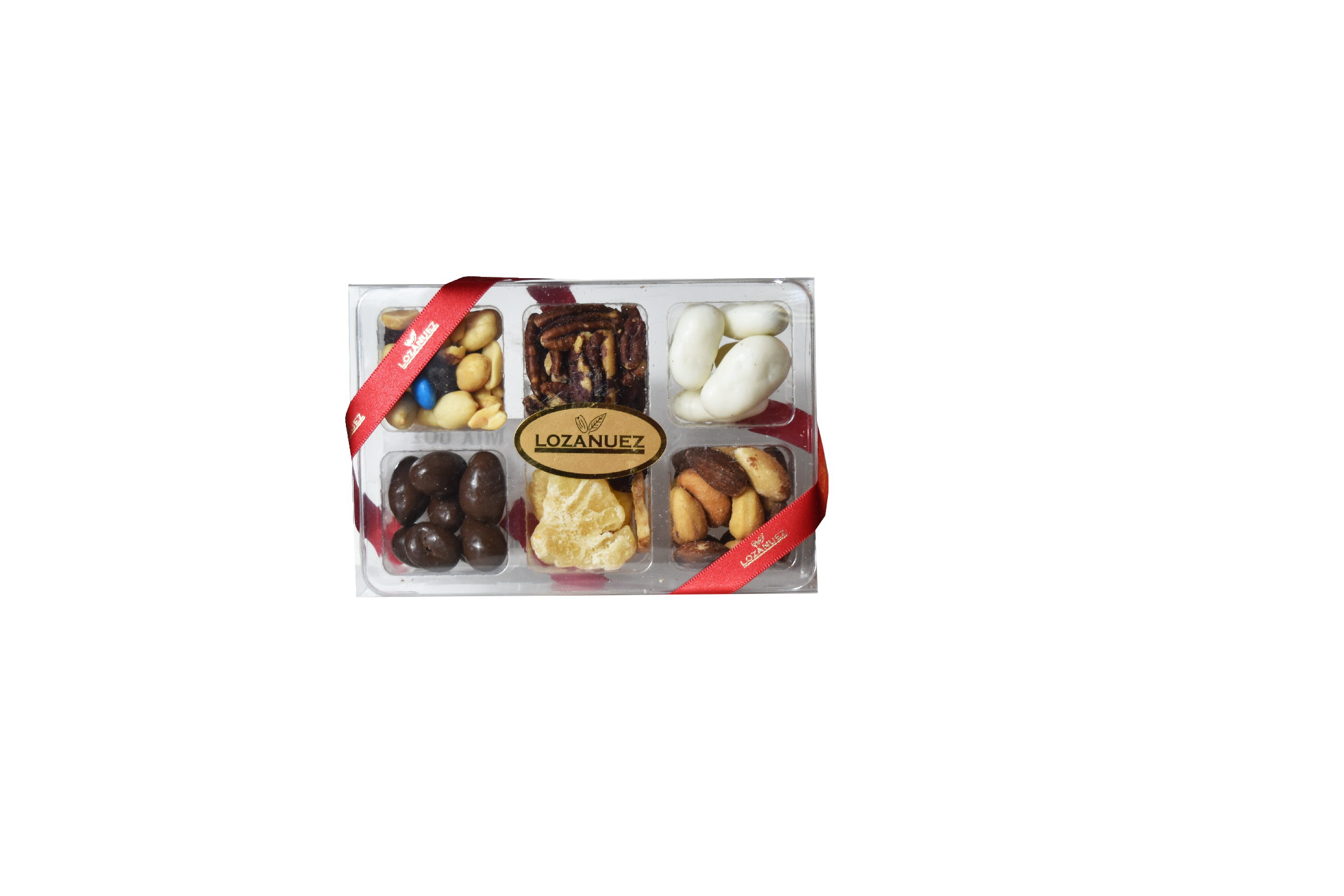 Caja de regalo variedad de 6 nueces ,nuez con chocolate cafe y blanco ,delux mix , trail mix ,mix de frutas secas y nuez salada .